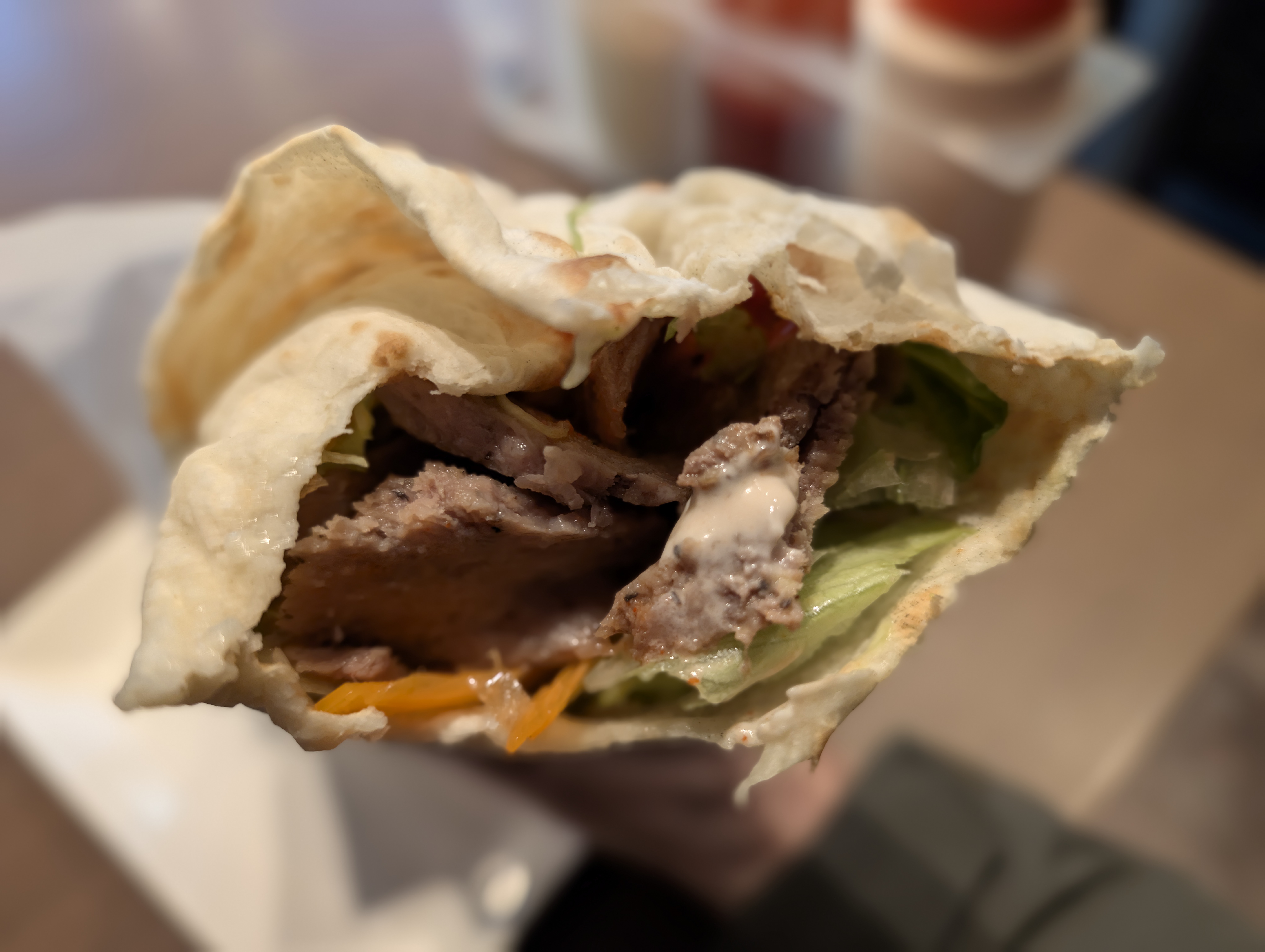 一般的なケバブショップのトルティーヤで包まれたケバブラップとは違い、丸く薄く焼いたナンで肉と野菜を包んでいます。野菜はキャベツの他、レタス、トマト、オリーブ、ピクルスなど多様な種類が入っています。ソースはミックスを選びましたが、別添えでソースも提供されました。